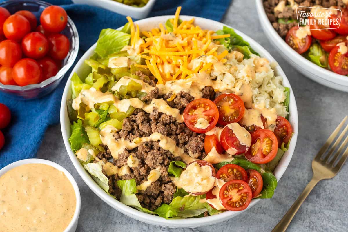 This Burger Salad tastes like a Big Mac in a bowl, but even better. This salad is so flavorful and delicious, you won’t even miss the bun!