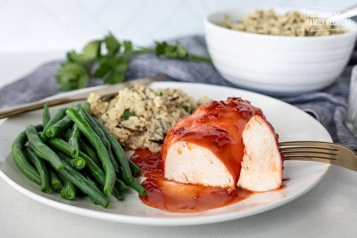 If you want a thicker glaze/sauce to serve with your chicken, there are a couple ways this can be accomplished. You can remove the chicken from the sauce, cover, and set aside. Take the leftover sauce and put it in a saucepan and simmer until it is reduced to your liking. My favorite way (and the faster way) is to combine a couple tablespoons of cornstarch with about ¼ cup water to create a slurry. Bring the sauce to a simmer on the stovetop and add the cornstarch mixture a little at a time, whisking constantly, until the sauce thickens to your liking.