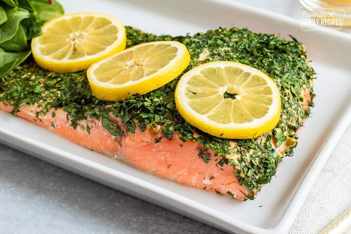 This Herb Crusted Salmon always turns out amazing. You will love the perfectly cooked flaky fish crusted in fresh herbs and drizzled with a tangy sauce.