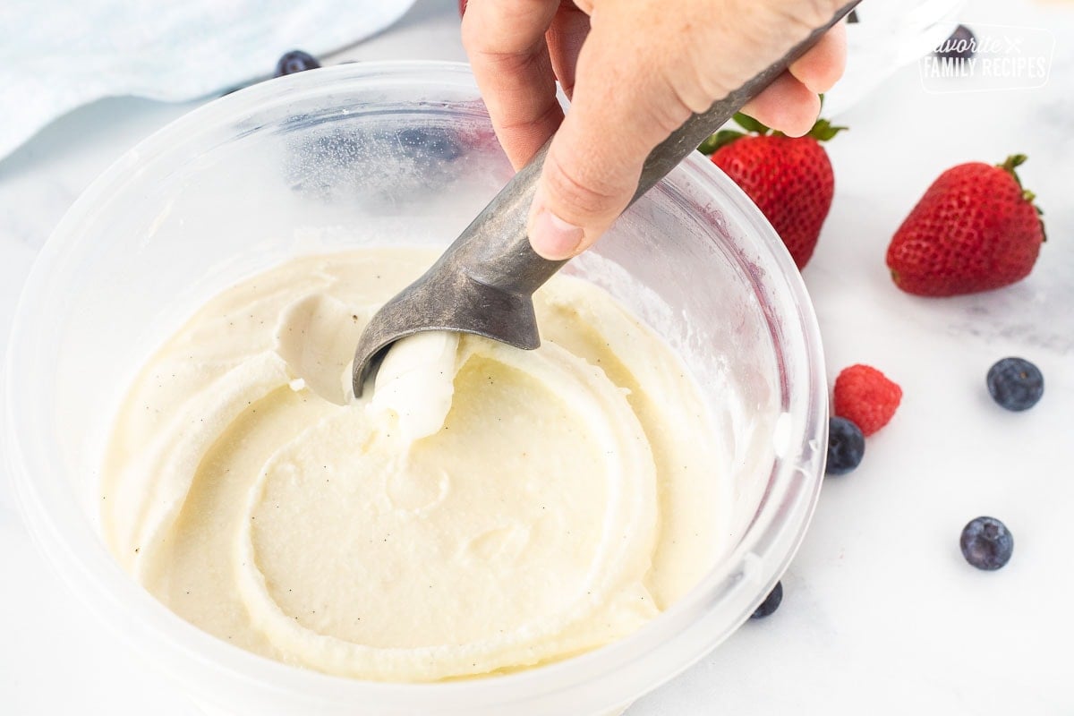 - Once the volume has increased by about half and reached a soft serve consistency, scoop into a bowl with a lid or a loaf pan and harden in the freezer.