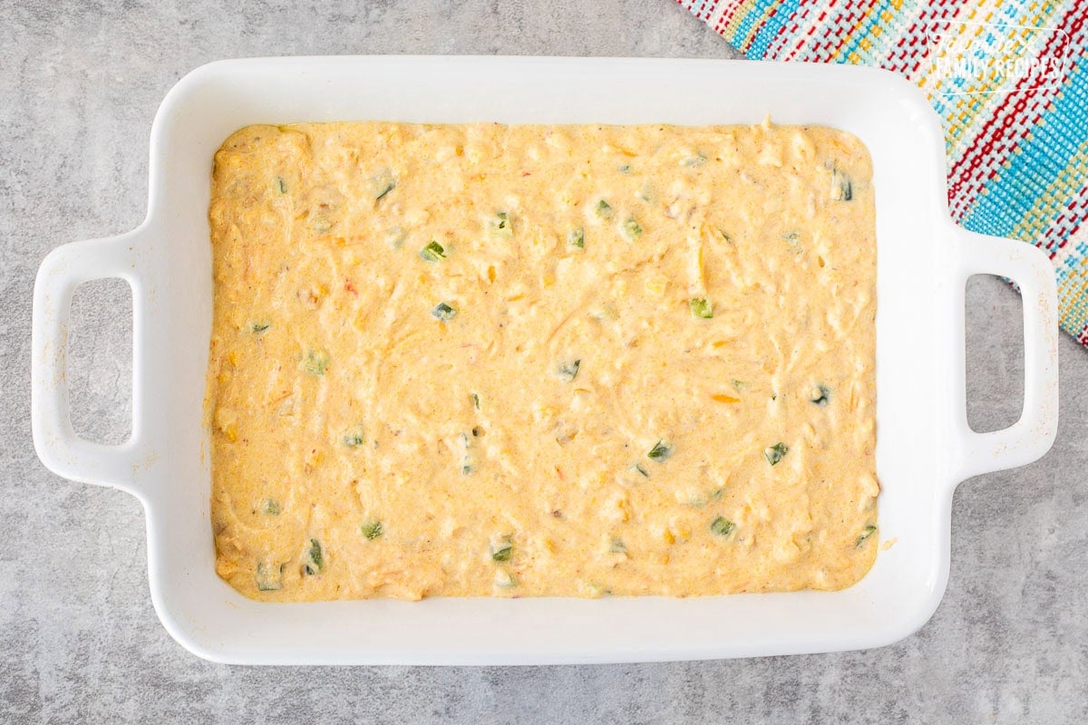 - Pour into a greased 9×13 baking dish and spread evenly with a spatula.