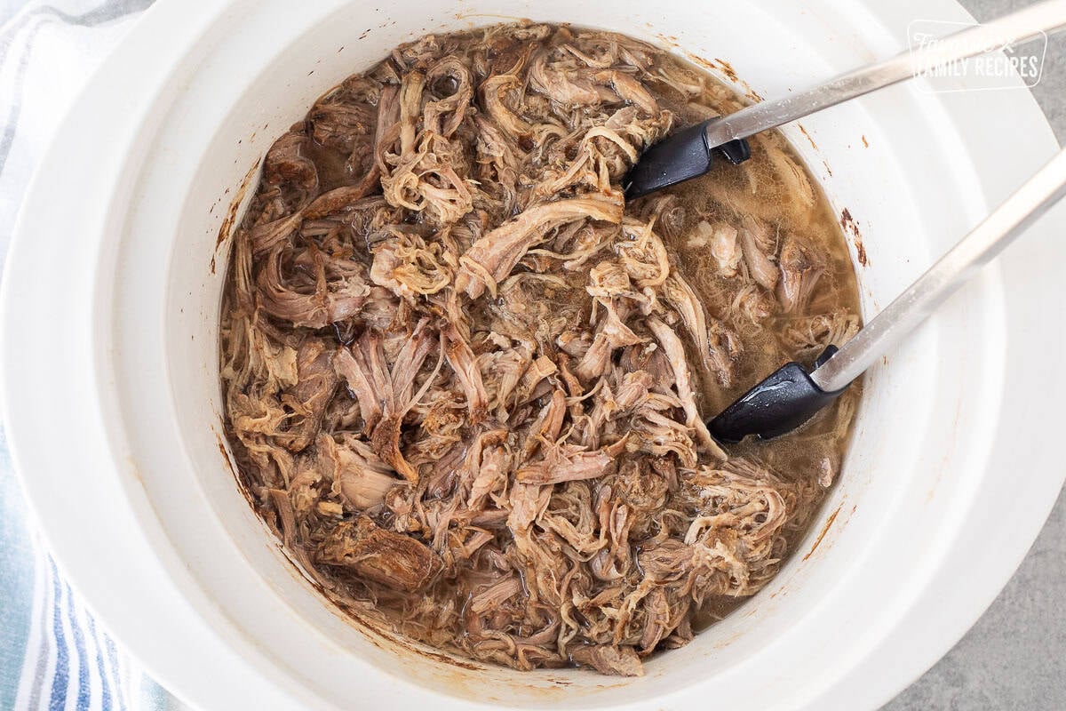 - Shred the pork directly in the slow cooker using two forks, mixing it with the juices. Let it rest uncovered for about 20-30 minutes. Measure out 2 cups of shredded pork for the mac and cheese. Set aside.