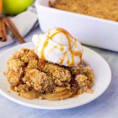 Traditional Apple Crisp is always a favorite fall treat! Tender apples cooked to perfection with a sweet crumb topping. Don't forget the ice cream!